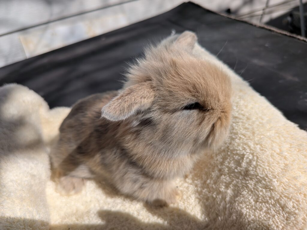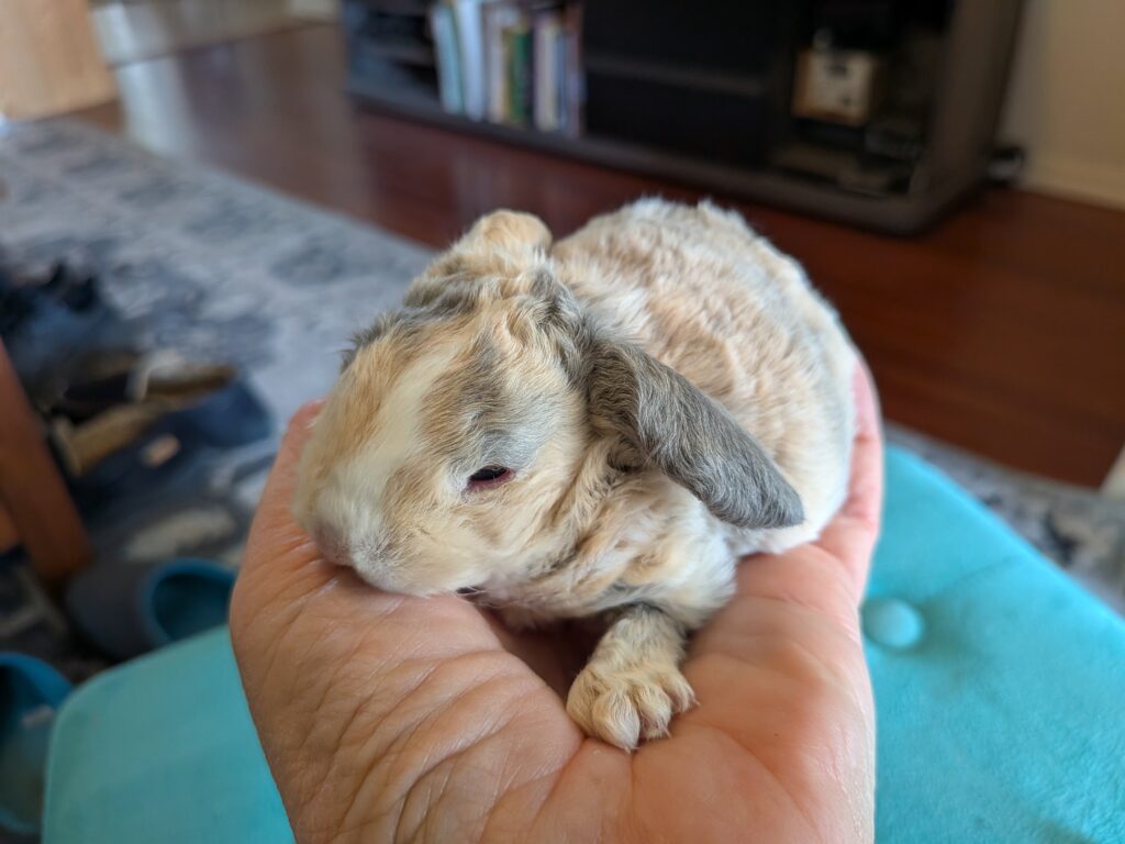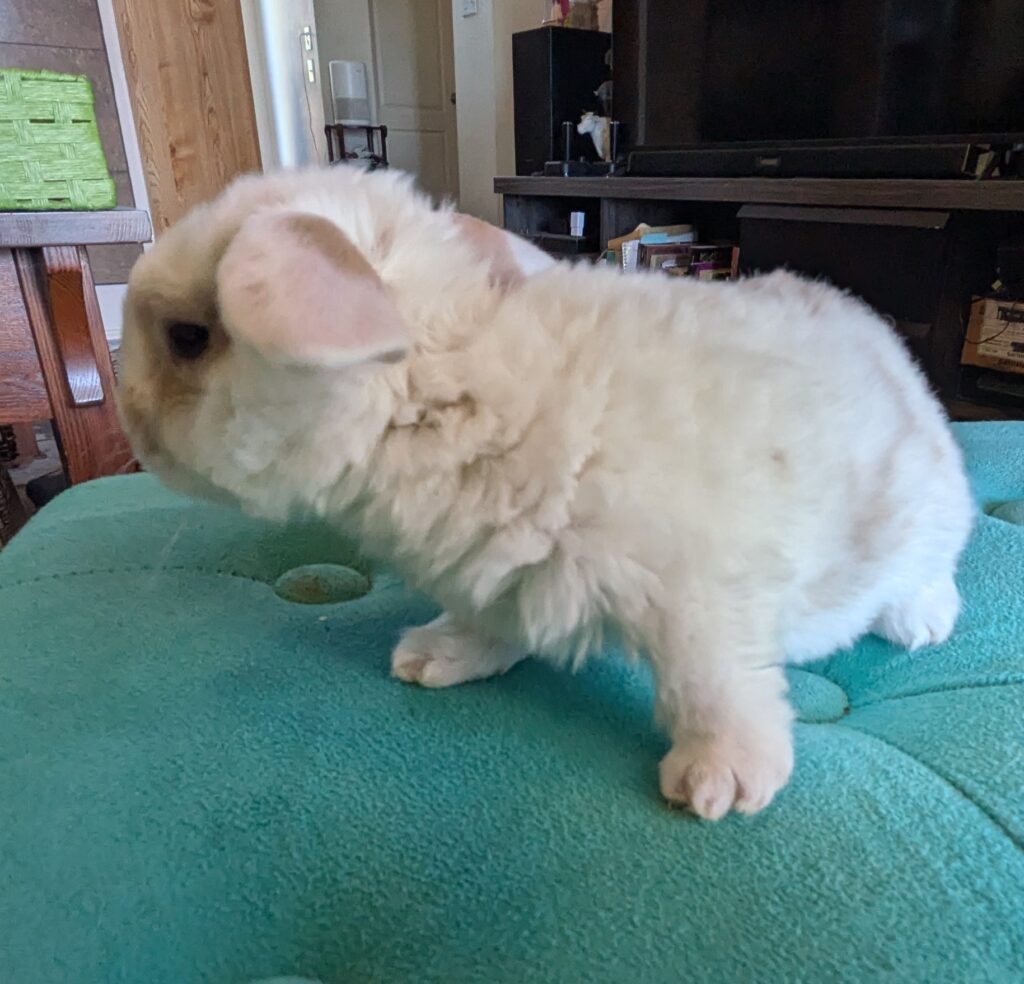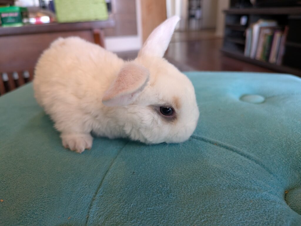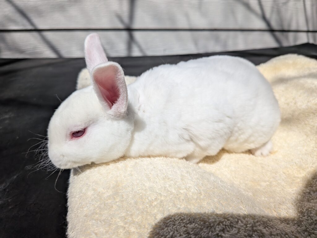 Super chill White 2 month Mini Rex Doe. On sale for $80.